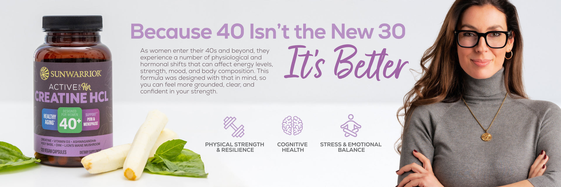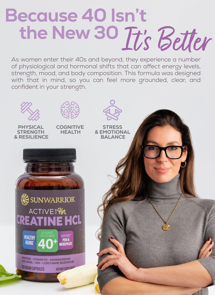 Sunwarrior’s Active Creatine HCL For Her 40+ is formulated specifically for strength, focus, and hormonal balance.