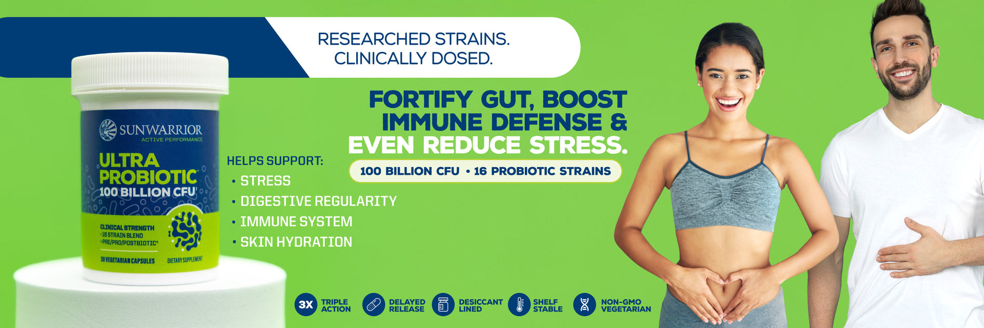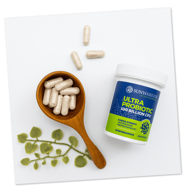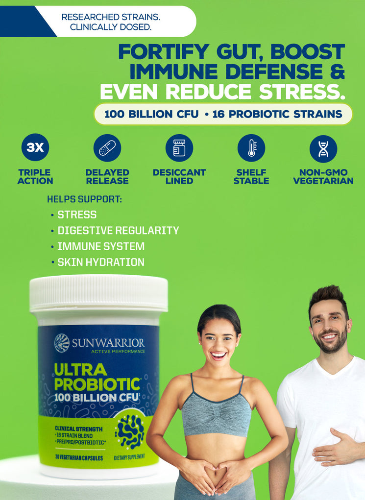 Sunwarrior’s Active Ultra Probiotic Capsules offer a powerful daily boost for gut health, immune support, and stress management with 100 billion CFU from 16 clinically studied strains. This advanced formula features key probiotic strains from plant and dairy sources like L. paracasei Lpc-37® to help regulate stress and B. lactis Bl-04® for immune and respiratory support.
