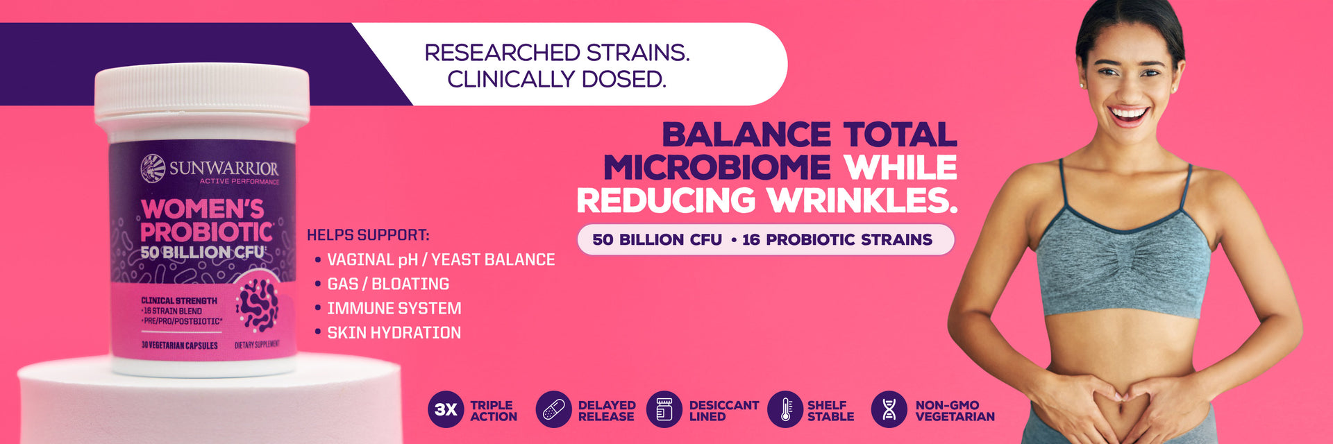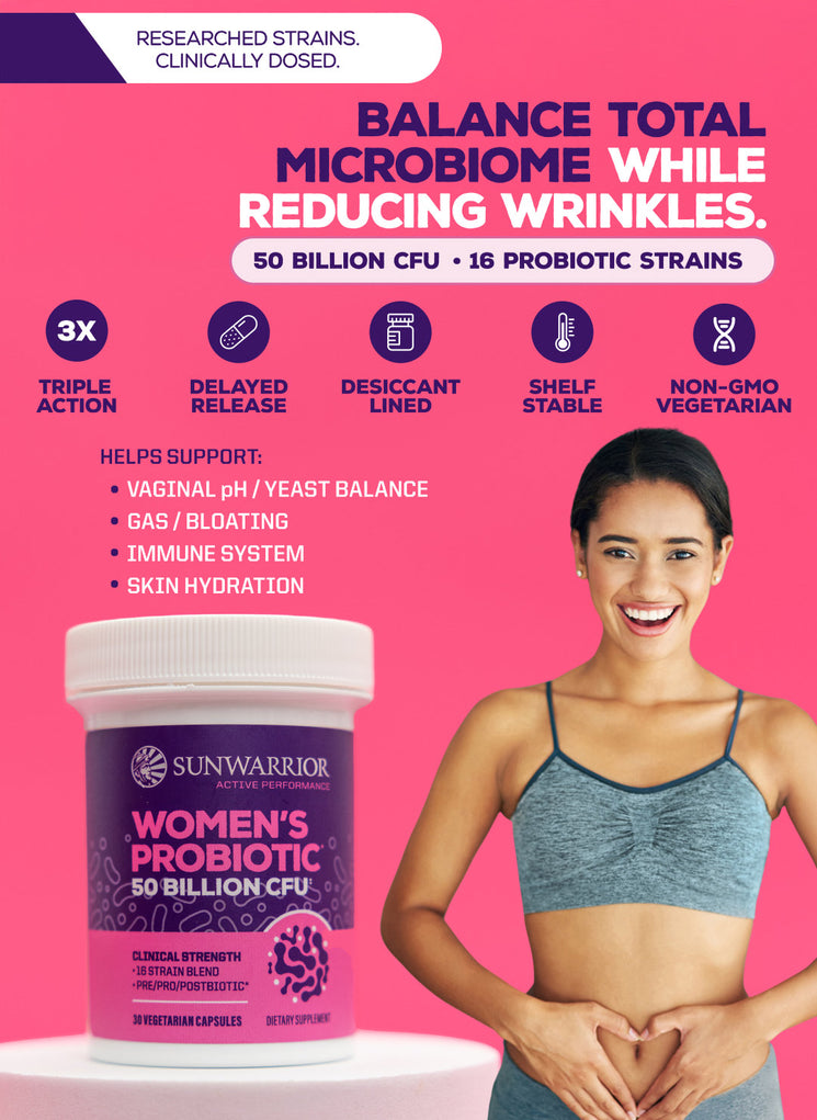 Support your body from the inside out with Sunwarrior’s Active Women’s Probiotic Capsules—specially formulated for women’s unique needs. With 50 billion CFU and 16 powerful probiotic strains from both plant-based and dairy sources, this clean, high-performance supplement promotes digestive health, vaginal balance, immune defense, and radiant skin.