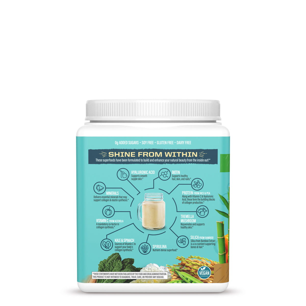 Pollutants in water, air, and food deplete our collagen storehouse making replenishment vital. A majority of collagen supplements come from the bones, skin, and connective tissue of animals, including cattle, fish, horses, pigs, or rabbits. Why ingest animal-derived collagen when your body is designed to generate its own? Sunwarrior offers the plant-based solution, tailored to boost your body’s inherent collagen production. It’s our inside-out approach!