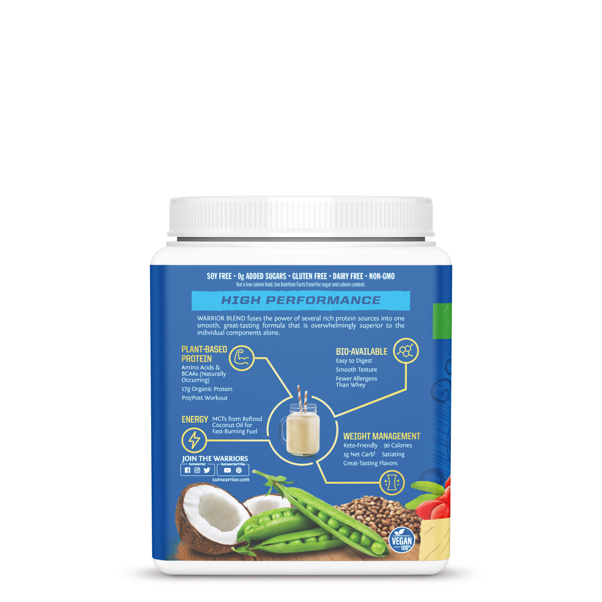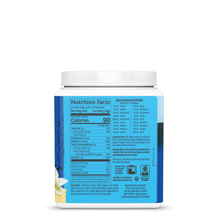 Sunwarrior's Warrior Blend Protein Powder is a top-quality plant-based protein supplement designed to fuel the body with clean and sustainable protein. The great-tasting formula boasts a powerful blend of organic pea protein, hemp protein, and goji berry powder, providing a well-rounded supplement to support muscle recovery and growth. Medium-chain triglycerides from coconut work synergistically with the other ingredients to create a unique vegan protein exceptionally rich in amino acids and BCAAs.